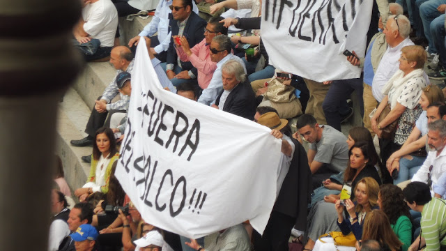 El mal hacer de sus apariciones en el palco de D. Gonzalo J. de Villa Parro, ha exacerbado a un buen número de aficionados que democráticamente han expresado su opinión verbal y por escrito. Al grito de ¡FUERA DEL PALCO! y exhibieron dos pancartas con el mismo lema.