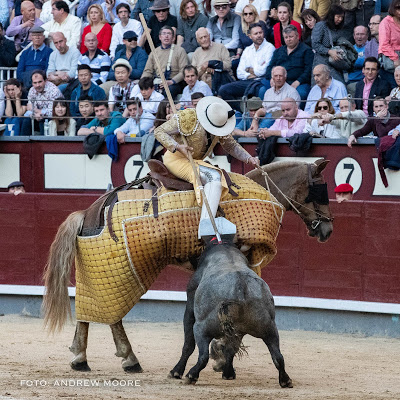 Moral. que tuvo lo más potable del encierro, calcó dos faenas idénticas, fuera del sitio de torear, se dedicó a aprovechar el viaje y acompañar la embestida con una figura descompuesta, es curioso que por momentos se jaleara esa forma de torear, cuando no se sabe quien torea a quien, si el torero al toro o el toro al torero. Muy mal con los aceros fue pitado en los dos toros.