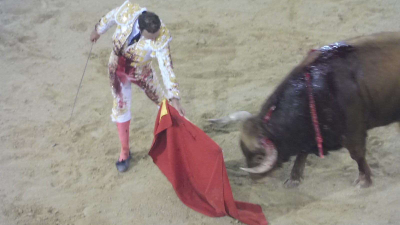 Entra a matar Ferrera por derecho y hunde la espada en buen sitio, pero al salir del embroque la saca dejándola en media. He ahí el torero listo, estaba cogido y se apoyó en la espada para salir del problema con torería.